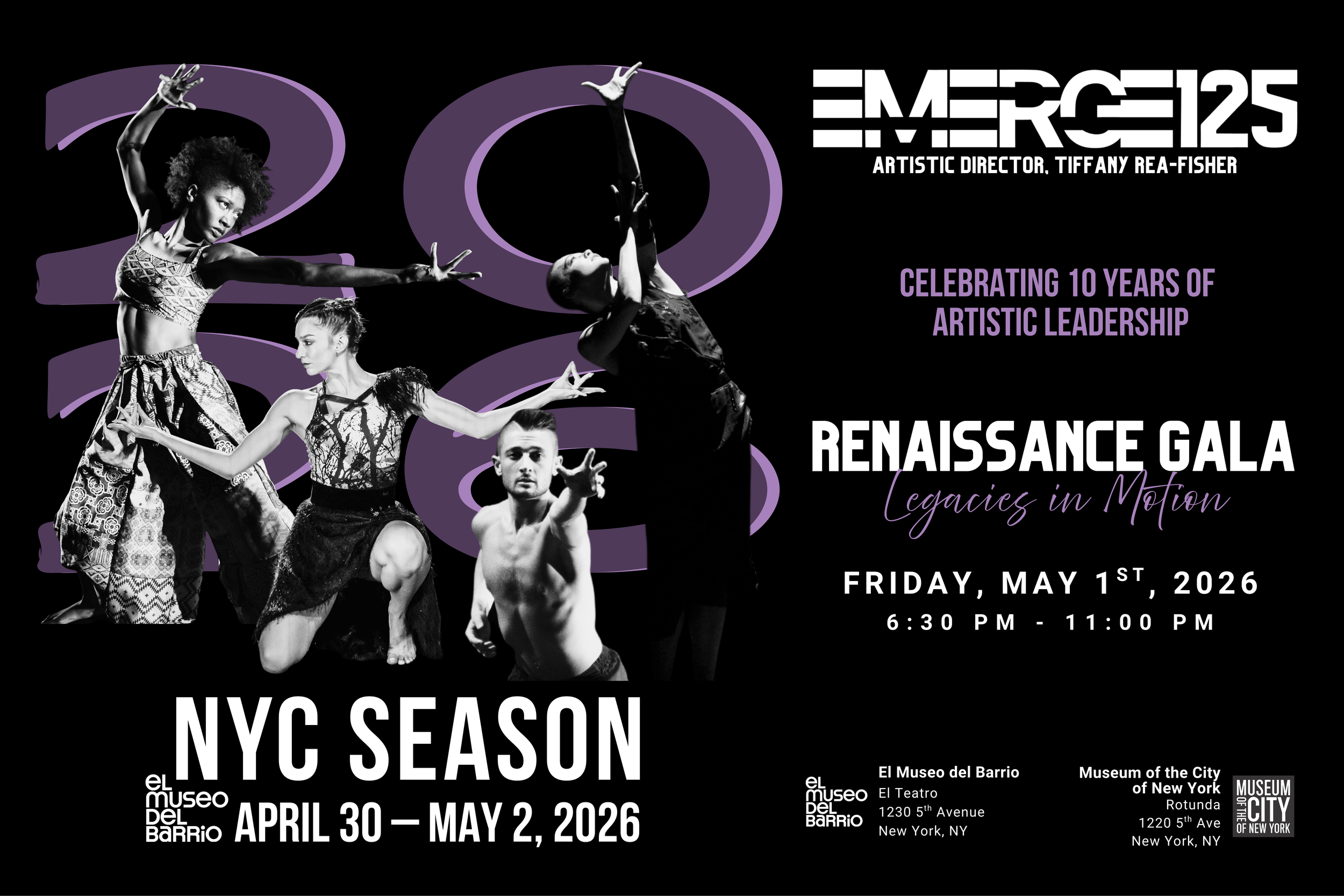 EMERGE125 charts a path forward to a bold and expansive future as we celebrate the ten-year anniversary of our Artistic Director Tiffany Rea-Fisher. On April 30, May 1, and May 2 at El Museo del Barrio in Spanish Harlem, E125 will present three new works that embrace the meaningful social issues of our time.